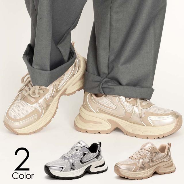 厚底スニーカー レディース ローカット ランニングシューズ 運動靴 シルバー ゴールド グレー ベージュ 靴 シューズ レースアップ スポーティ メッシュ素材 メタリックカラー レトロフューチャー ストリートスタイル 美脚 脚長効果