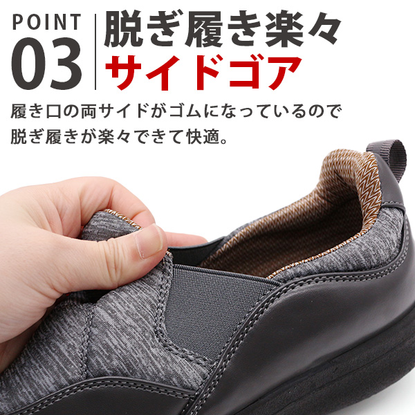 サイドゴアで脱ぎ履きも楽々。スリッポンタイプなので、紐を結ぶ手間もありません。