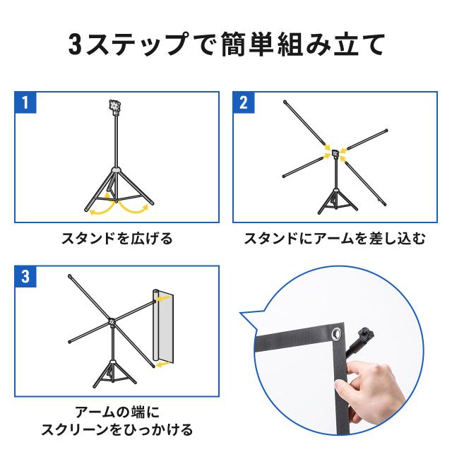 ●スタンドにアームを挿してスクリーンを取り付けるだけの組み立てのため、工具を使用しない簡単組み立て設計になっています。