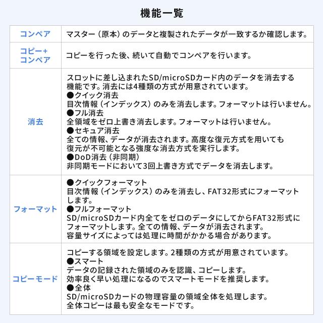 ●機能はコンペア、消去、フォーマットなどの機能があります。