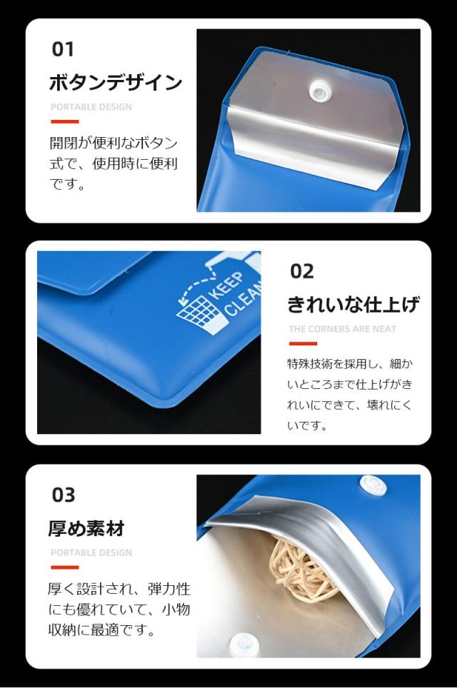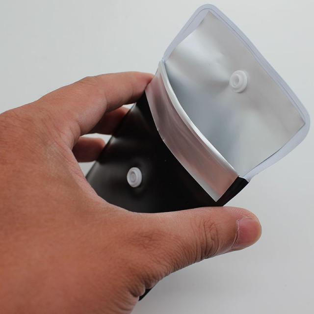 ■ポケットティッシュとセットでお持ちいただいて、使用済みのティッシュや飴の個包装、ガムなどををスマートに処理いただけます。このように内袋がアルミなので様々なシーンでご利用可能です。