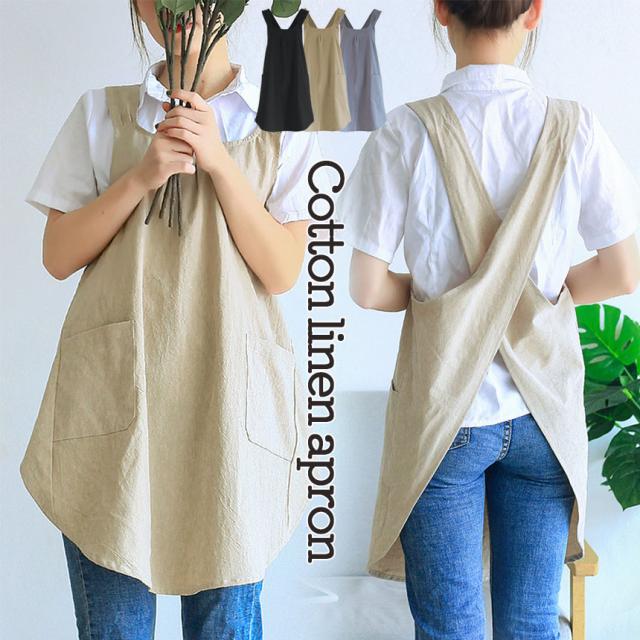 綿麻エプロン ラウンドネックエプロン リネンコットンエプロン ワンピースエプロン レディースエプロン 無地 綿麻 ワークエプロン ワンピースタイプ レディース エプロン コットン リネン シンプル ワンピース コットンリネン バッククロス 北欧 おしゃれ かわいい 韓国風