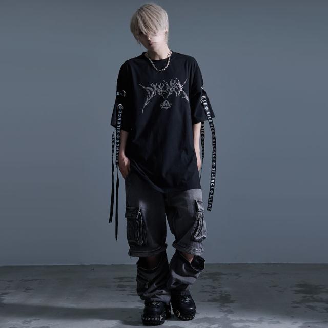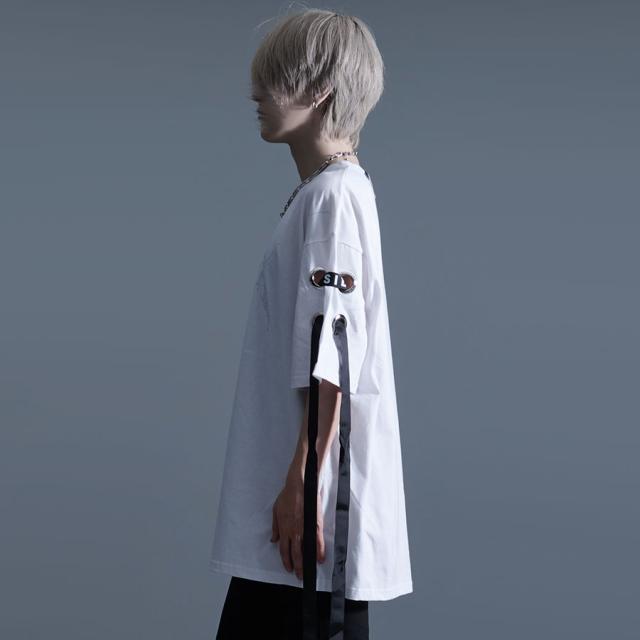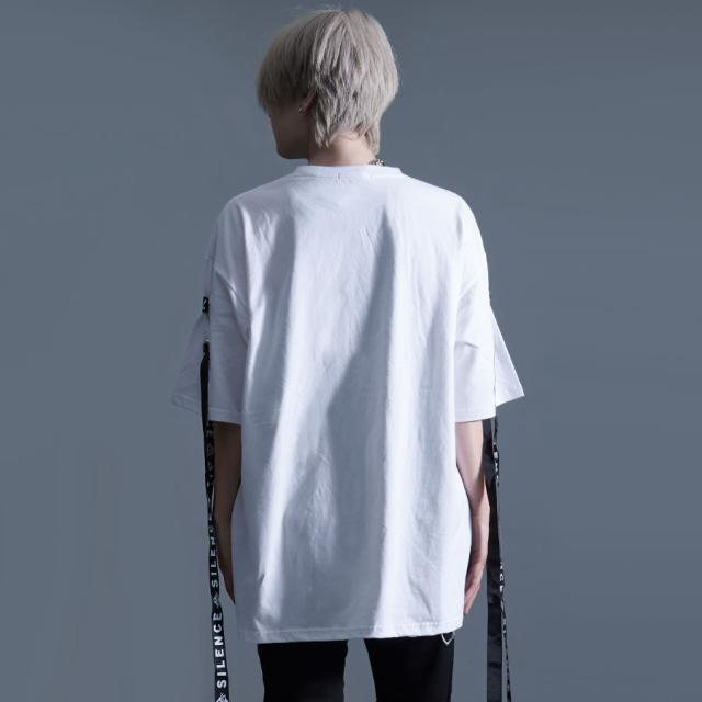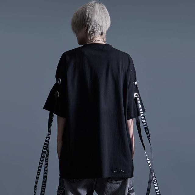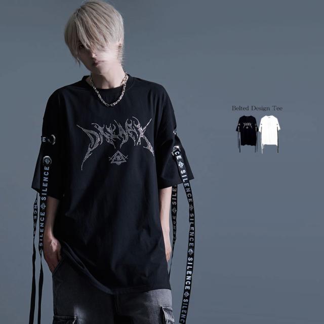 セール SALE Tシャツ 半袖 メンズ レディース ビッグT ラインストーン レースアップ ベルト リボン ロゴ プリント トップス カットソー ビッグシルエット オーバーサイズ ゆったり 綿100% ブラック 黒 ホワイト 白 M L モード系 韓国 メンズファッション 即日発送 [295991]