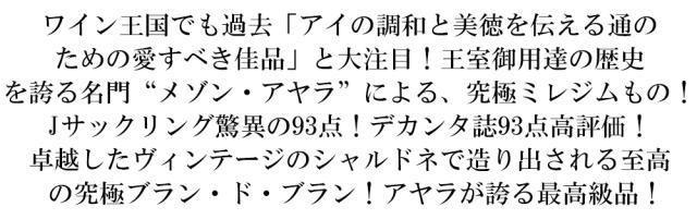 ワイン王国でも過去「アイの調和と美徳を伝える通の ための愛すべき佳品」と大注目!王室御用達の歴史 を誇る名門“メゾン・アヤラ”による、究極ミレジムもの! Jサックリング驚異の93点!デカンタ誌93点高評価! 卓越したヴィンテージのシャルドネで造り出される至高 の究極ブラン・ド・ブラン!アヤラが誇る最高級品!