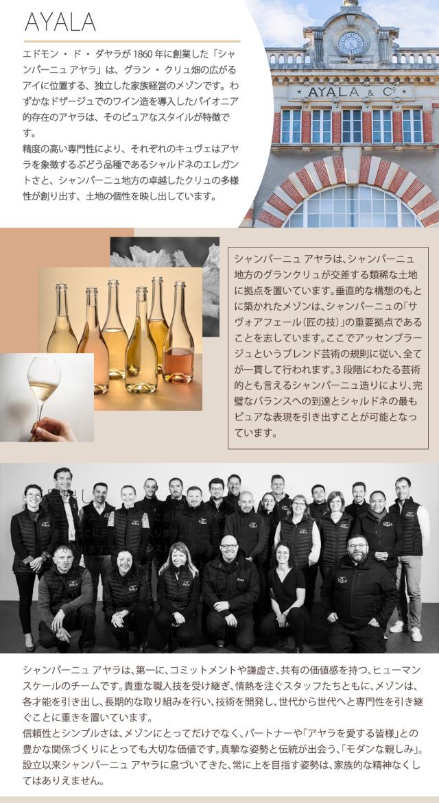 【アヤラはもともとスペインの貴族の家柄であり、スペイン領であった南米で独立戦争を戦ったのち、コロンビアの外 交官としてパリに赴任した父を持つエドモンド・デ・アヤラが、シャンパーニュ地方でシャンパーニュ造りを学んだことから彼らの醸造の歴史が始まりました。