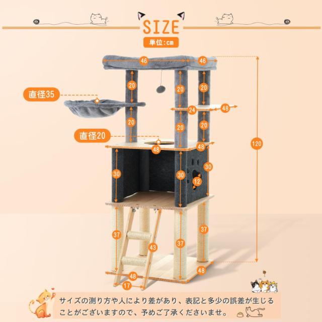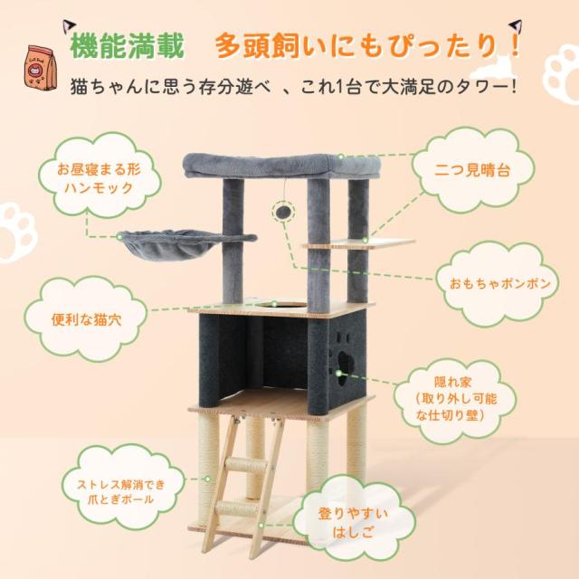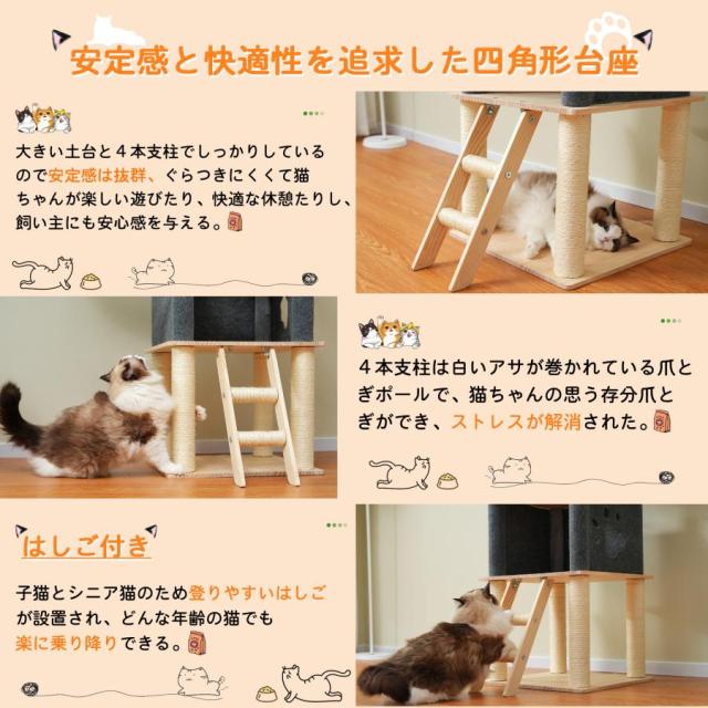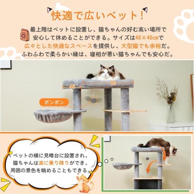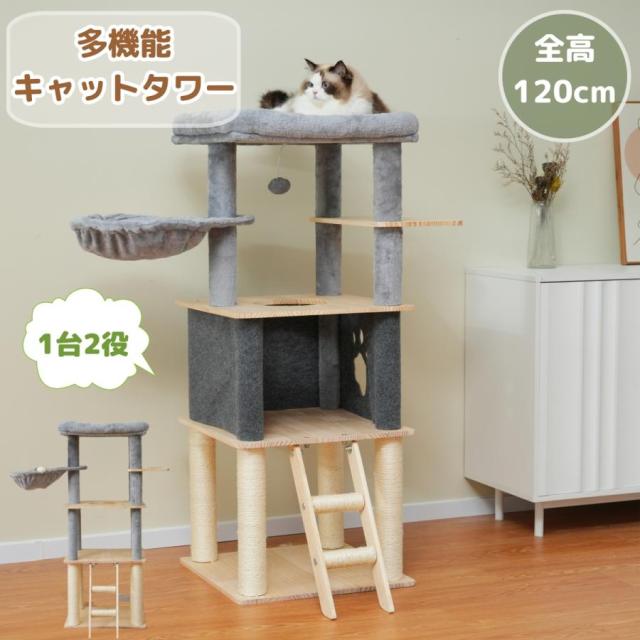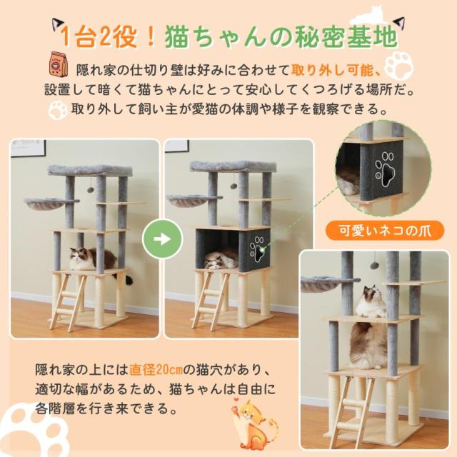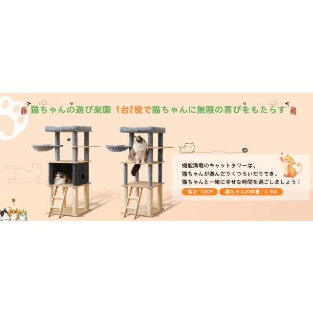 【商品仕様】商品サイズ:幅48×奥行き48cm×高さ120cm。重量(約)11kg。宇宙船直径約30cm。材質:天然松の木。【一台二役、シーンに合わせてサイズが変えられる】キャットタワーには大きな隠れハウスがあり、暗い場所が好きな猫にパーソナルスペースを提供します。隠れ家の仕切り壁は好みに合わせて取り外し可能、取り外して飼い主が愛猫の体調や様子を観察できます。 猫ちゃんの様々なニーズを満たすことができます。飼い主と猫ちゃんが多くの喜びを楽しむことができます。【安定感抜群の台座】4ヶ所しっかりした支える支柱と安定性がアップされ、倒れにくいし、ぐらつきにくくたっぷり遊べます。キャットタワーが安全で信頼性のある環境を提供し、愛猫のための安定した楽しい空間を提供することで、安心感を得ることができます。【爪とぎポールを4本ご用意】猫ちゃん達は余裕に爪とぎができます。麻製は丈夫で長持ちで、ホコリが出にくく清潔です。