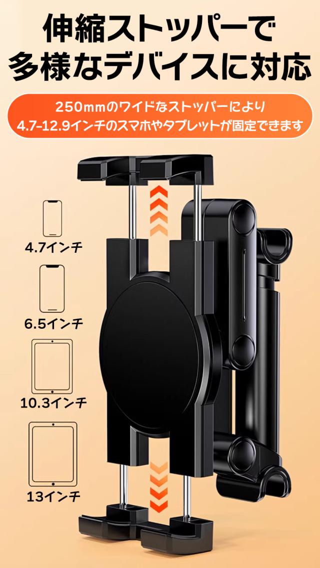 | 250mmのワイドなストッパーにより4.7-12.9インチのスマホやタブレットが固定できます |