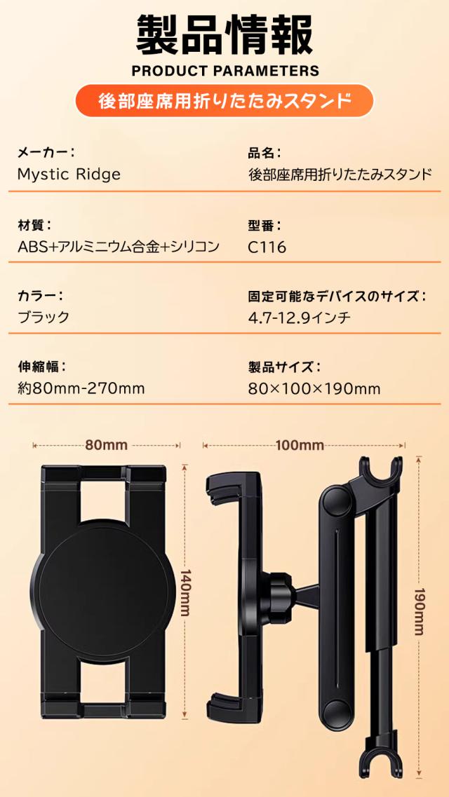 材質:ABS+アルミニウム合金+シリコン カラー:ブラック 伸縮幅:約80mm-270mm 固定可能なデバイスのサイズ:4.7-12.9インチ 製品サイズ:80×100×190mm |