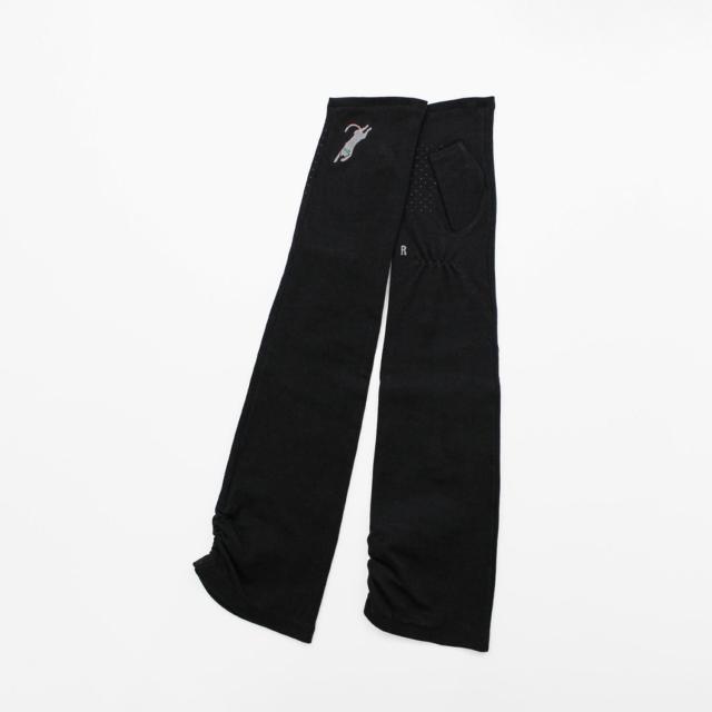 お昼寝中のねこの刺繍がかわいい、全長約50cmのフィンガーレスタイプのグローブ。綿100%のしっとりソフトな素材を使用。掌側には、左右分かりやすいように『L』『R』の刺繍と滑り止め付き。