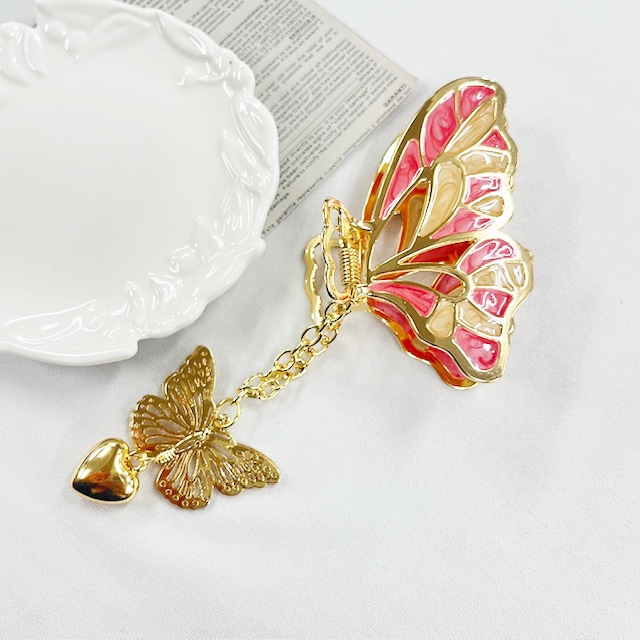 鮮やかなカラーがアクセントとなってくれる蝶モチーフのバンスクリップ。動くたびに揺れるゴールドのチャームがポイント。大き目サイズでしっかり髪をまとめてくれます。