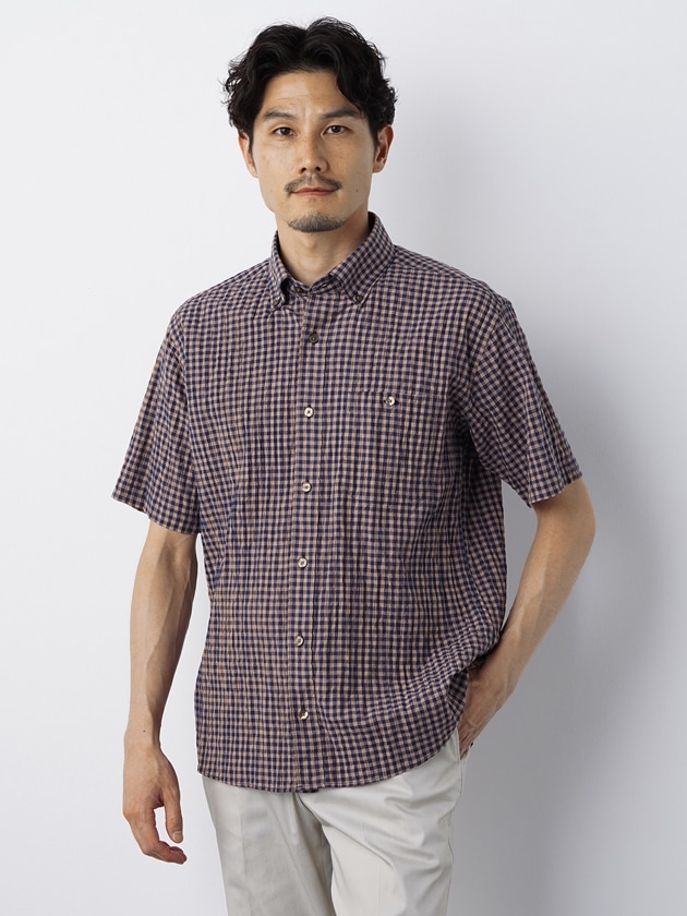 涼し気なシボ感が特徴のシャーリングワッシャーギンガムチェック生地を使用した釦ダウン半袖シャツ。