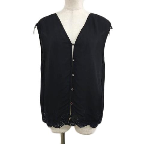 【中古】ミミ&ロジャー ブラウス シャツ Vネック パンチングレース リボン シアー 透け感 ノースリーブ 38 黒 紺