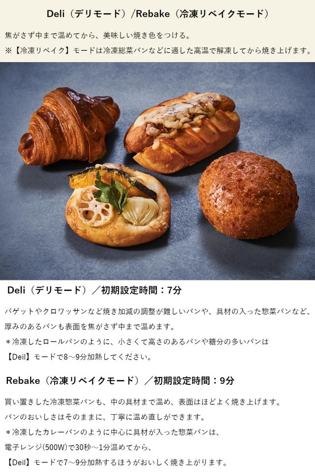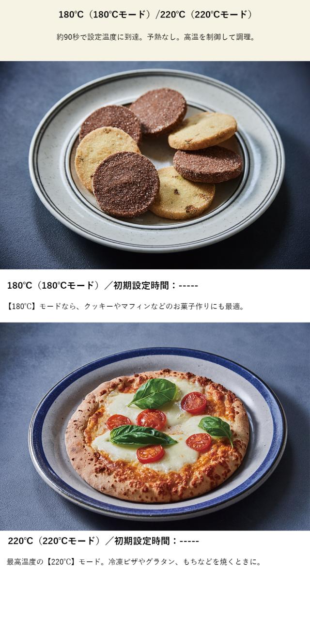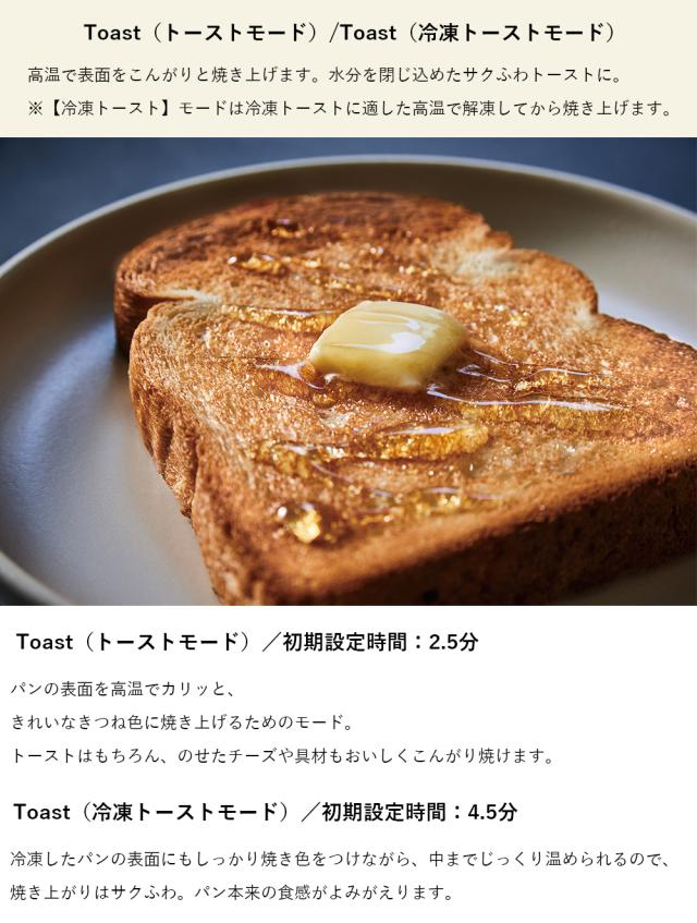 「よく使う焼き加減」を手軽に。マイコン制御の6つのモード メニューボタンを押して、ダイヤルスイッチを押すだけの簡単操作。トースターとして普段使いに便利な6モードを搭載。各モードはボタンを押して選択できます。マイコンによる温度と時間の自動制御で、食パン、冷凍パン、惣菜パンなど、それぞれ最適な焼き上がりを手軽に実現します。 | 6つのモードで、温度も時間もお任せあれ