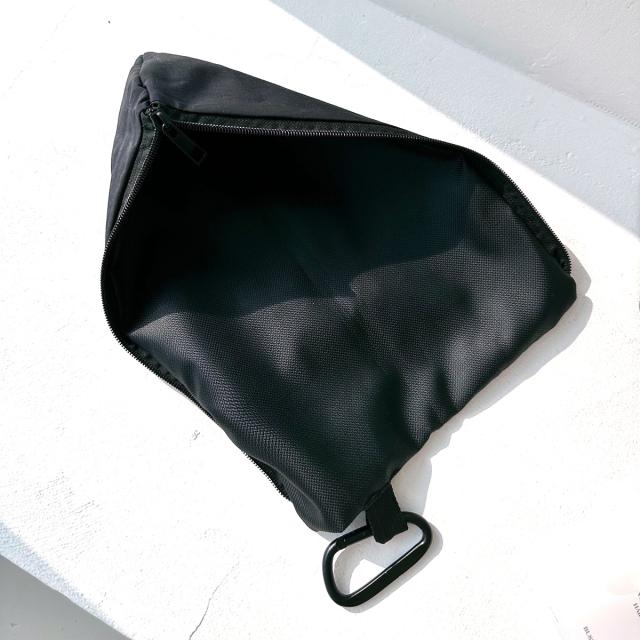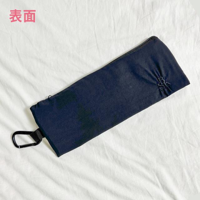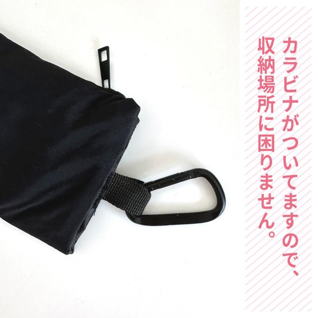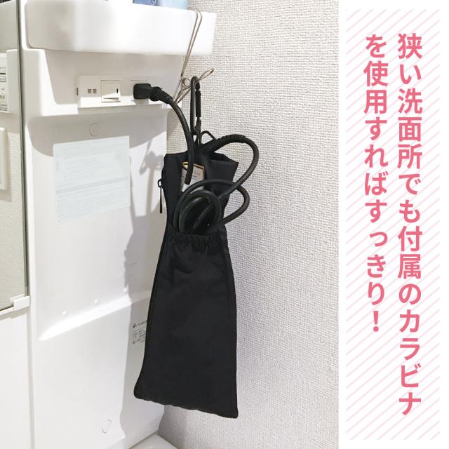 カラビナが付いているので、出先でのハンガーや洗面所のポールに掛けて収納できます。