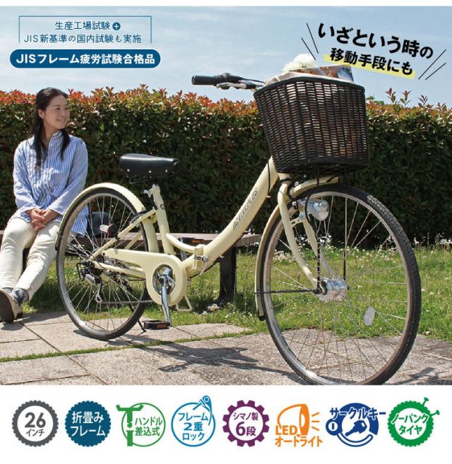 【仕様】26インチ・ノーパンクタイヤ・折畳みフレーム・6段変速・カゴ・LEDオートライト・サークルキー・カゴサイズ:約W37××D24×H26cm