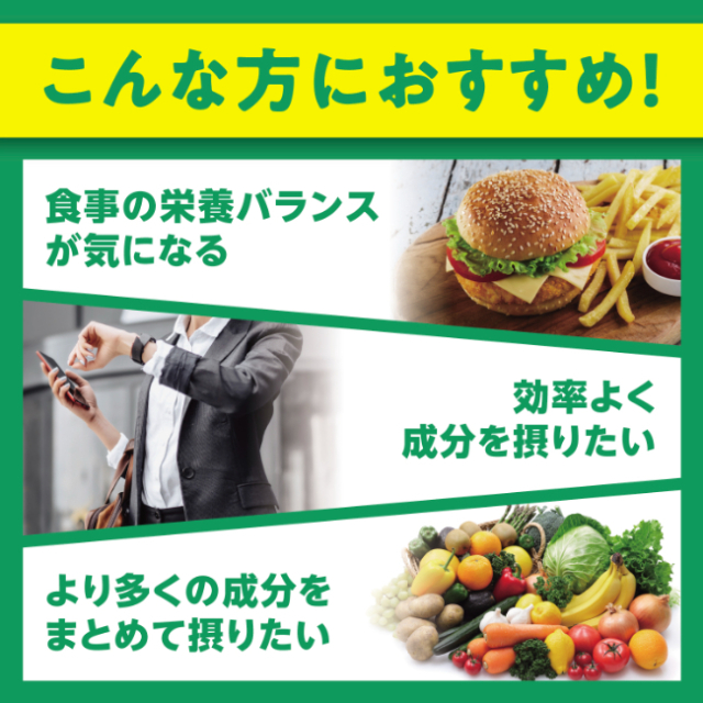 ビタミンとミネラルをはじめとした健康の基本を支える多彩な栄養素と、健康な毎日を応援するサポート成分を、40種まとめて摂れるオールインワンサプリメントです。効率的にたくさんの成分を摂りたい方はもちろん、複数のサプリを飲むのが面倒、という方にもおすすめです。