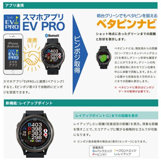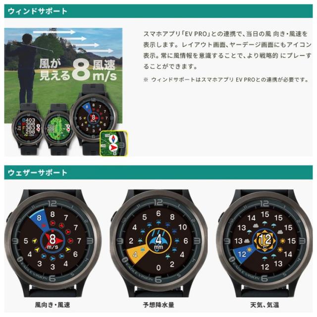 | プロフィール | スマホアプリ「EV PRO」との連携で、当日の風 向き・風速を表示します。 レイアウト画面、ヤーデージ画面にもアイコン 表示。 常に風情報を意識することで、より戦略的 にプレーすることができます。 ※ウィンドサポートはスマホアプリ EV PROとの連携が必要です。 |