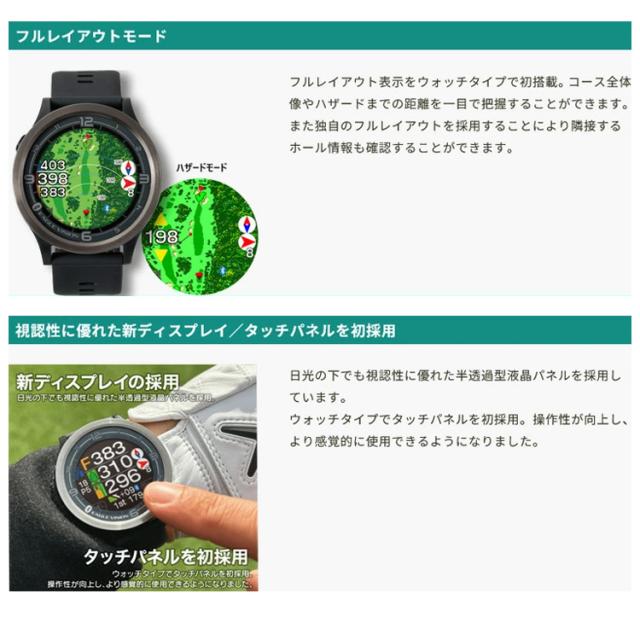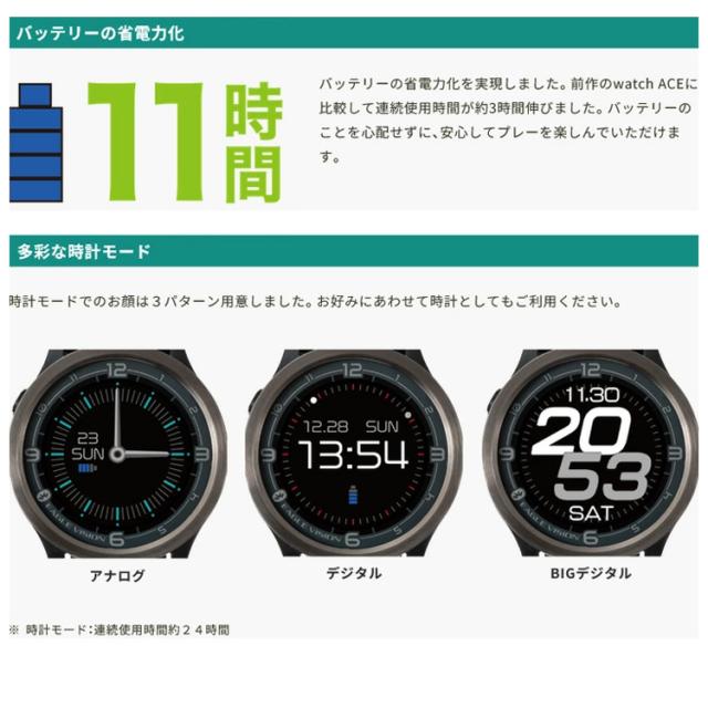 | 仕様 | ■GPS仕様:GPS / GLONASS(グロナス) / MSAS / QZSS(みちびき)L1S信号対応 ■通信仕様:Bluetooth(R)SMART ■スマホアプリ連携:○ ■ディスプレイ:240×240ドットカラー液晶 ■防水仕様:IPX7 ■外形寸法:幅46mm×縦46mm×厚さ15mm ■重量:41g ■電源:Li-ion電池(USB Type-Cから充電) ■使用時間:ゴルフモード:約11時間 時計モード:約24時間 ■動作温度範囲:-10?60度 ■充電温度範囲:0〜40度 |
