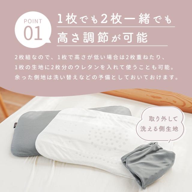 | ・1枚でも2枚一緒でも高さ調節が可能 2枚組なので、1枚で高さが低い場合は2枚重ねたり、1枚の生地に2枚分のウレタンを入れて使うことも可能。余った側地は洗い替えなどの予備としておいておけます。 ・腰、膝下、足首などに使い方いろいろ1枚は頭。もう1枚を腰、膝下、足首などの下に敷くことで、枕を余すことなくご使用いただけます。 ・小さいお子様にも、成長に合わせて使える成長に合わせて重ねて使うことや調整ができるため、小さいお子様用としてもおすすめです。 ・もっちりやわらか低反発ウレタン柔らかく、頭の形にフィットする低反発タイプ。凹凸により頭が沈みすぎない、程よい柔らかさです。 ・肩口にフィットしやすいカーブラインアーチ形状で首や肩口のラインに自然にフィットします。フィットしているので寝返りの抵抗も少なく、スムーズな寝返りをサポートします。 ・複数の通気穴で高い通気性を発揮複数の通気穴が高い通気性を発揮。通気性を確保し、頭の蒸れを軽減し快適な睡眠をサポートします。 ・安心の品質 西川製品品質にもこだわりたいという方も安心。日本有数の寝具メーカー「西川」の製品です。長年寝具を作ってきたからこその信頼できる品質があります。 | |