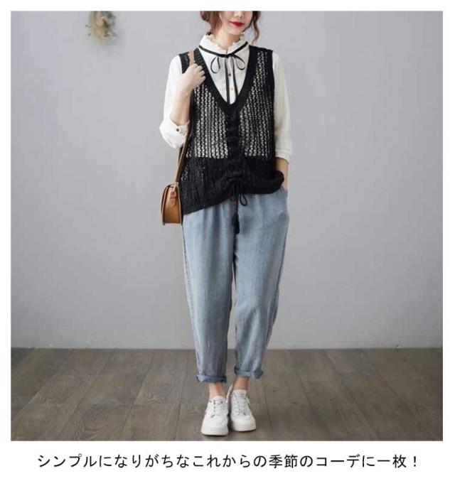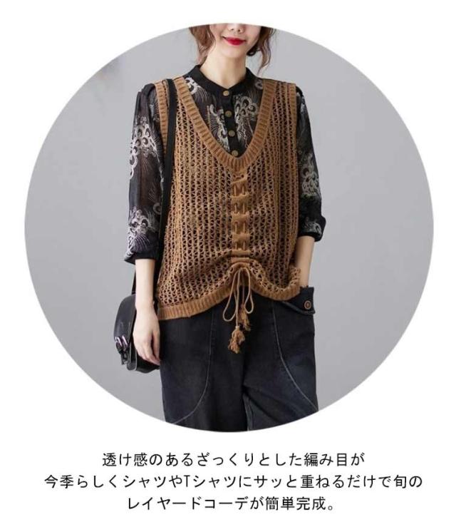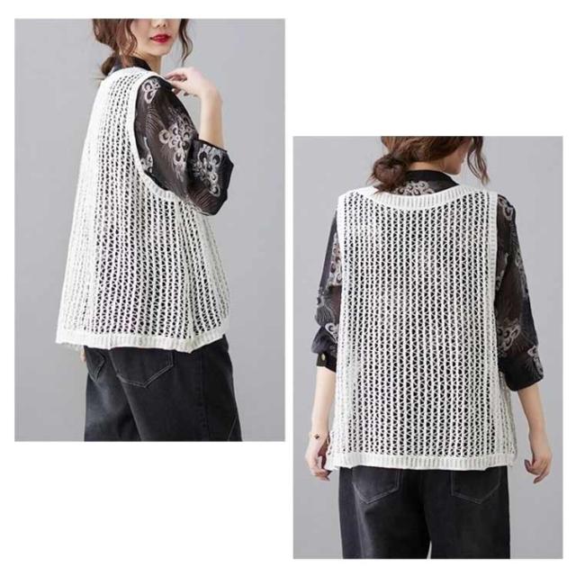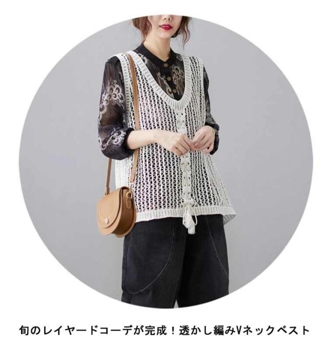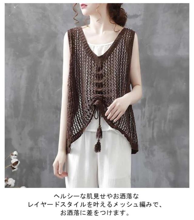 | 旬のレイヤードコーデが完成!透かし編みVネックベスト シンプルになりがちなこれからの季節のコーデに一枚! 透け感のあるざっくりとした編み目が今季らしくシャツやTシャツにサッと重ねるだけで旬のレイヤードコーデが簡単完成。 ヘルシーな肌見せやお洒落なレイヤードスタイルを叶えるメッシュ編みで、お洒落に差をつけます。 暑い季節にはキャミソールの上に重ねて涼しげコーデも。一枚あると大活躍なアイテムです。 さらりとした心地よい肌触りで、合わせるアイテムを変えればロングシーズン活躍してくれる優れもの。 | |