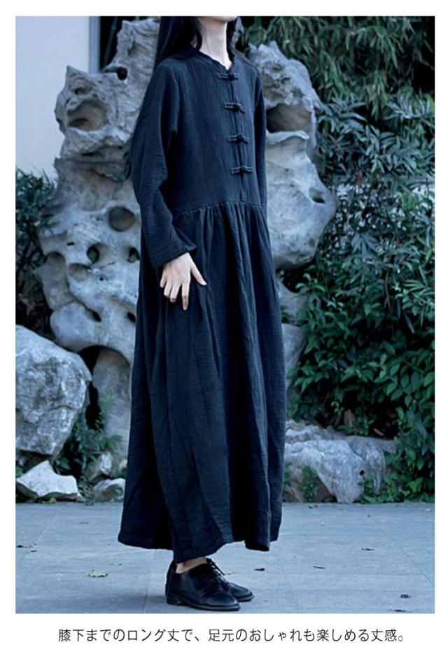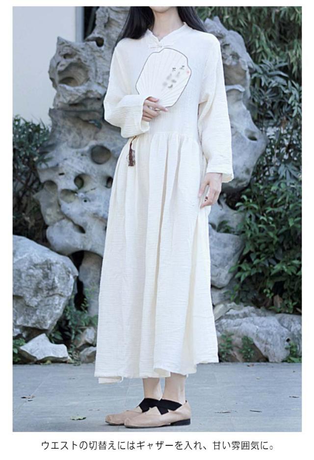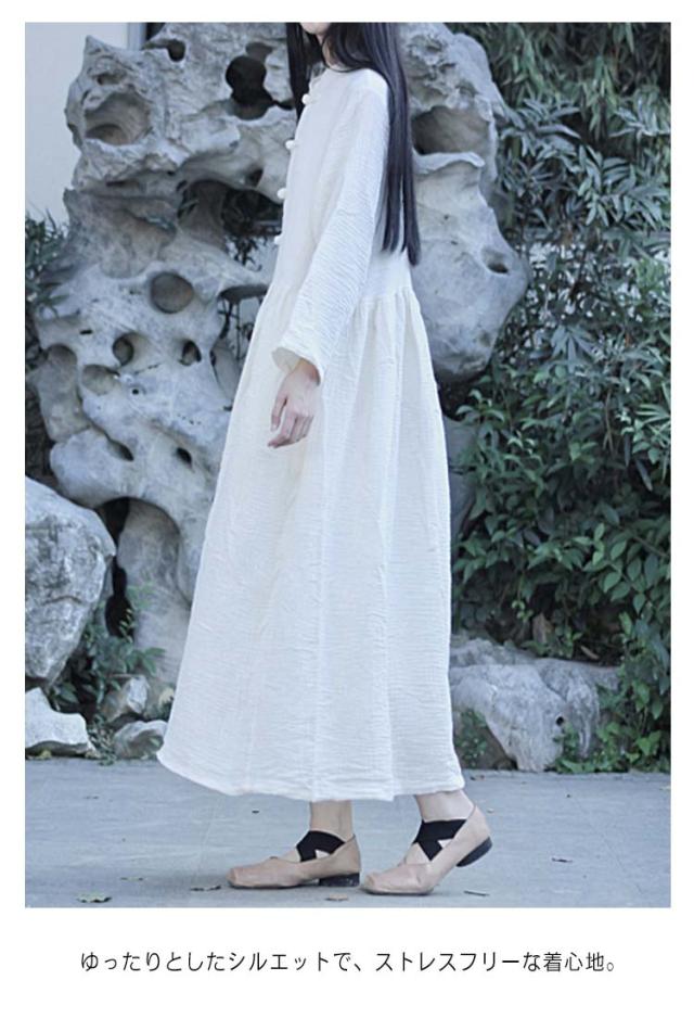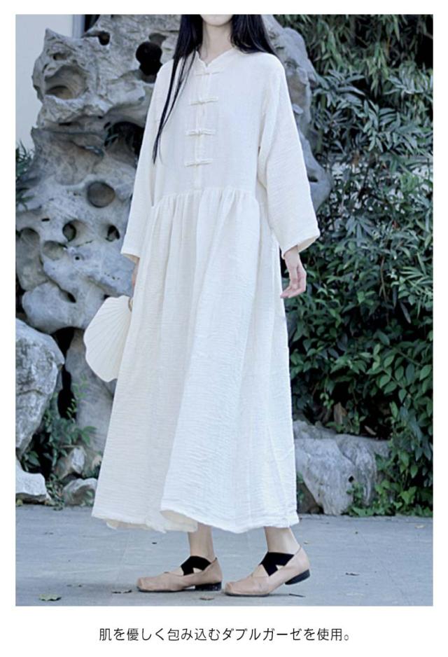 ダブルガーゼ レディース ワンピース シャツワンピース ギャザー チャイナボタン ダブルガーゼ 長袖 綿 Wガーゼ コットン ナチュラル きれいめ カジュアル ホワイト ブラック 春