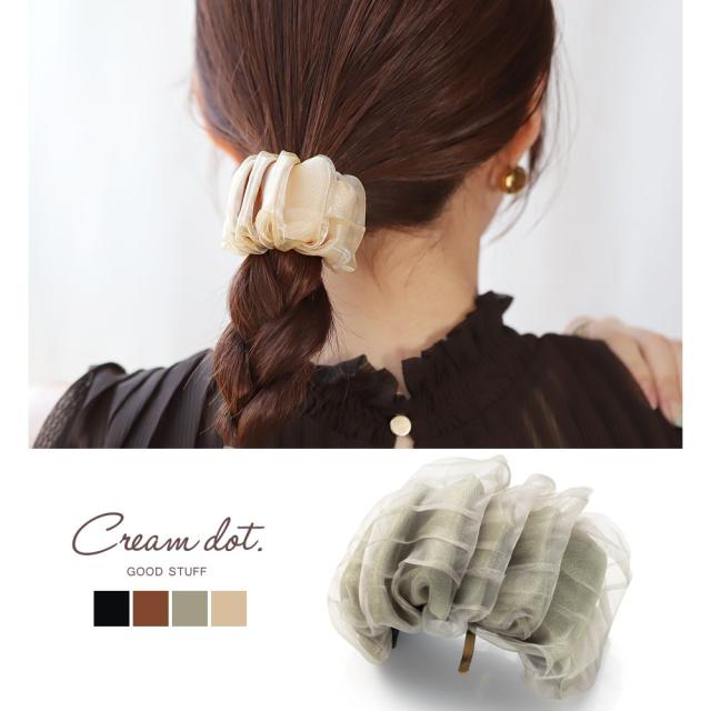 サテン調素材をオーガンジーで包み立体感を持たせたポニーフック。ワイヤー入りなので、スタイルに合わせてカーブラインが調節できます。上品で華やかなデザインだから、コーデのアクセントやオケージョンシーンにも◎