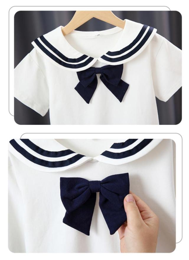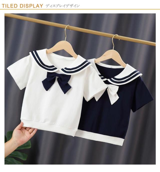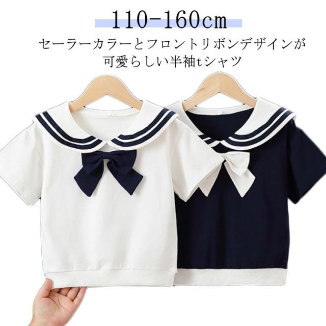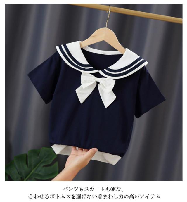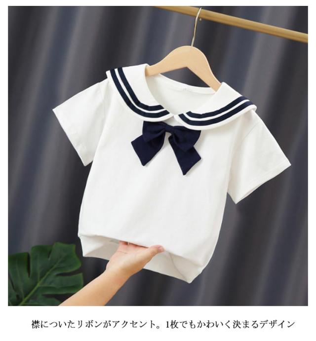 | 110cm 120cm 130cm 140cm 150cm 160cm セーラーカラーとフロントリボンデザインが可愛らしい半袖tシャツ 襟についたリボンがアクセント。1枚でもかわいく決まるデザイン キッズも気持ち良く着用できるよう、綿混の生地を採用 パンツもスカートもOKな、合わせるボトムスを選ばない着まわし力の高いアイテム | |