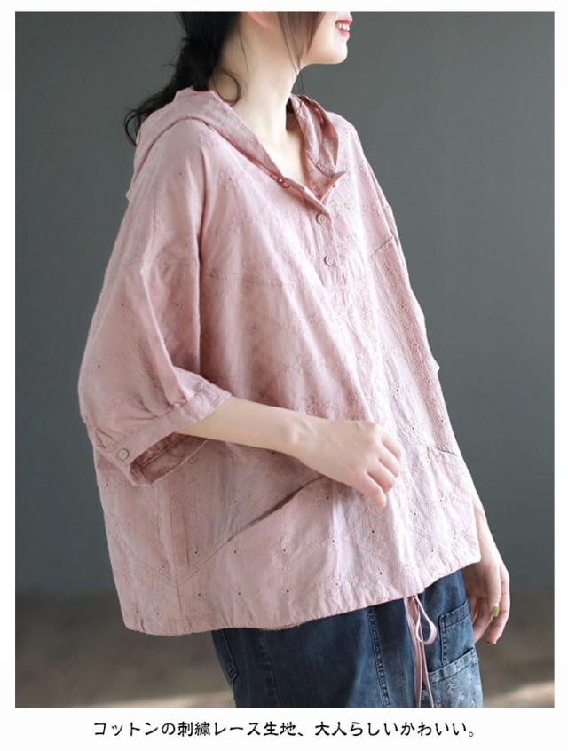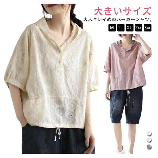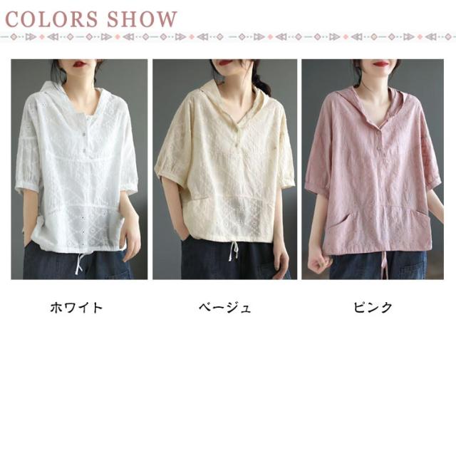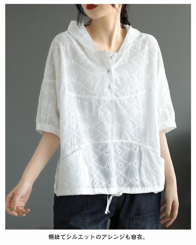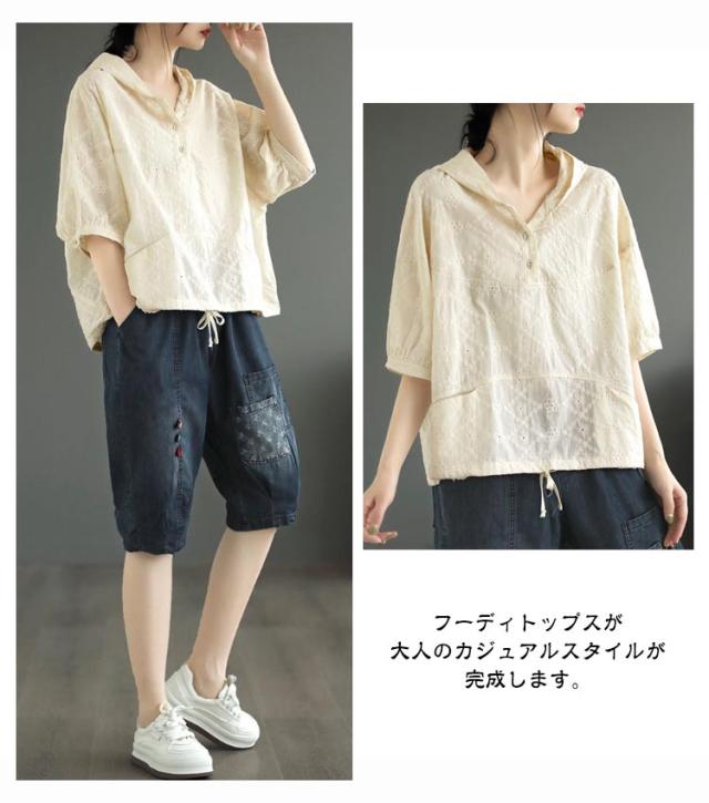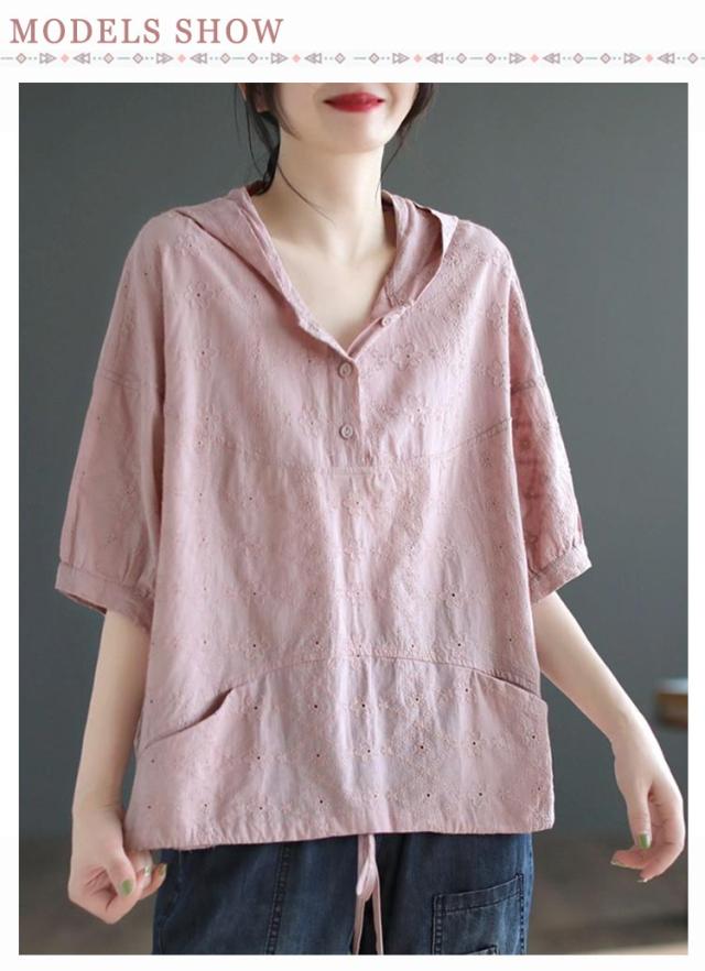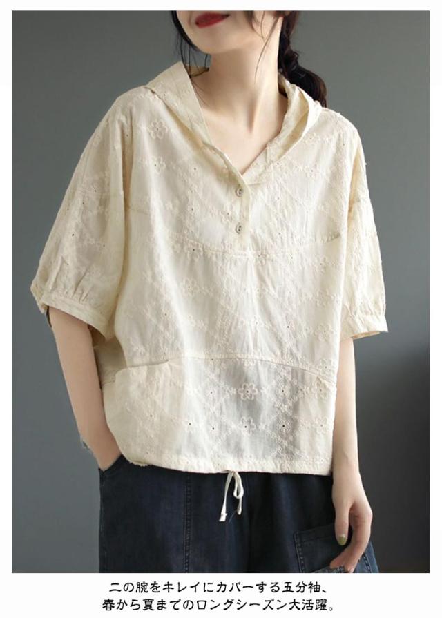 パーカー シャツ パーカーシャツ ブラウス トップス プルオーバー レース 5分袖 コットン フード付き 半袖 春夏 フード付きTシャツ 無地 体型カバー レディース 綿 コットン 着やせ 薄手 5分袖 夏服 フード付きシャツ