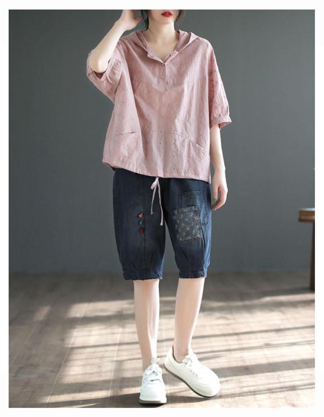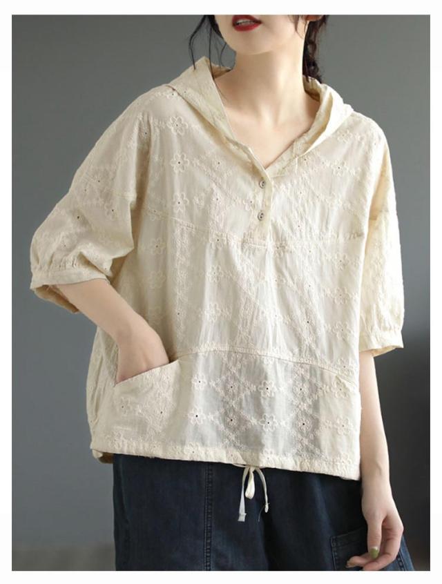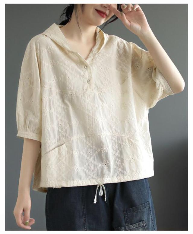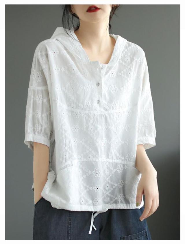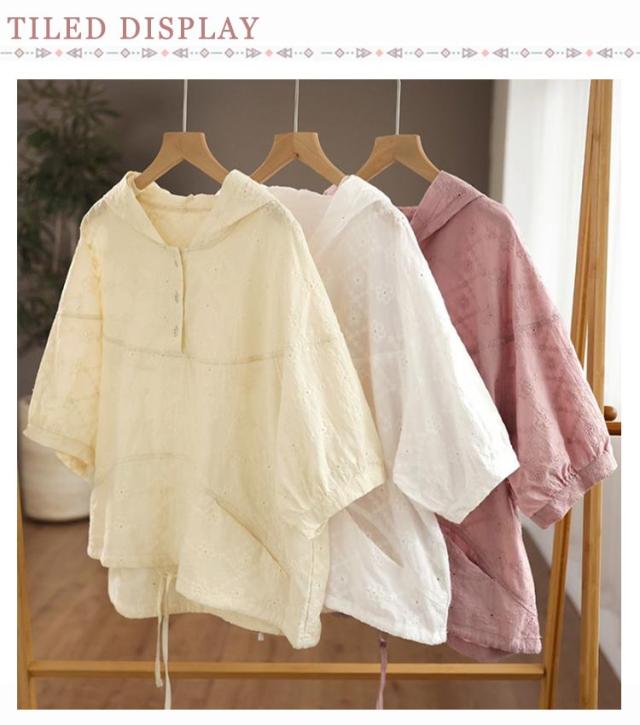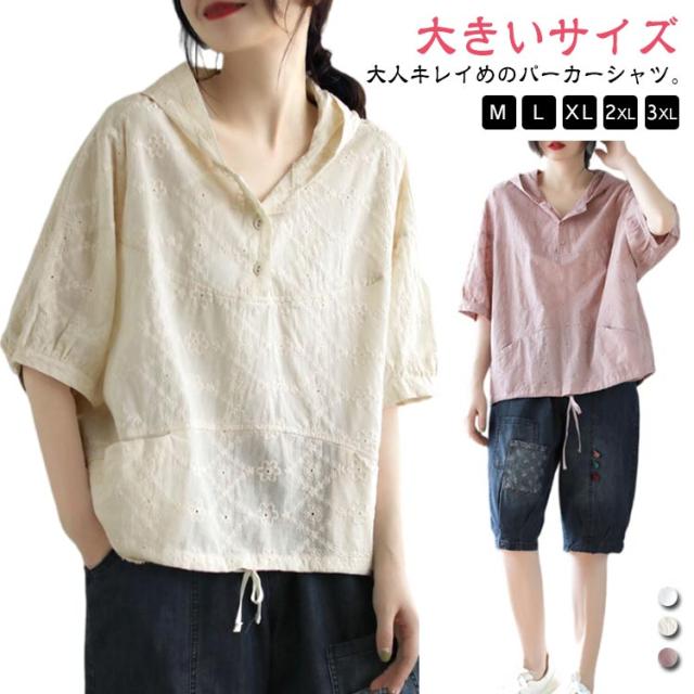パーカー シャツ パーカーシャツ ブラウス トップス プルオーバー レース 5分袖 コットン フード付き 半袖 春夏 フード付きTシャツ 無地 体型カバー レディース 綿 コットン 着やせ 薄手 5分袖 夏服 フード付きシャツ