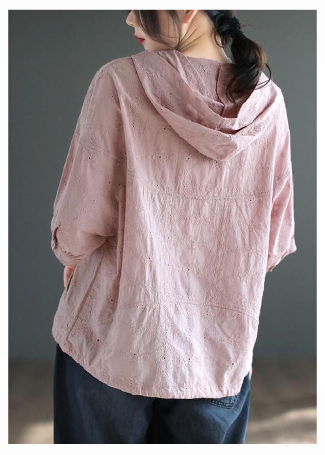 | 大人キレイめのパーカーシャツ。 コットンの刺繍レース生地、大人らしいかわいい。 二の腕をキレイにカバーする五分袖、春から夏までのロングシーズン大活躍。 フーディトップスが大人のカジュアルスタイルが完成します。 裾紐でシルエットのアレンジも自在。 | |