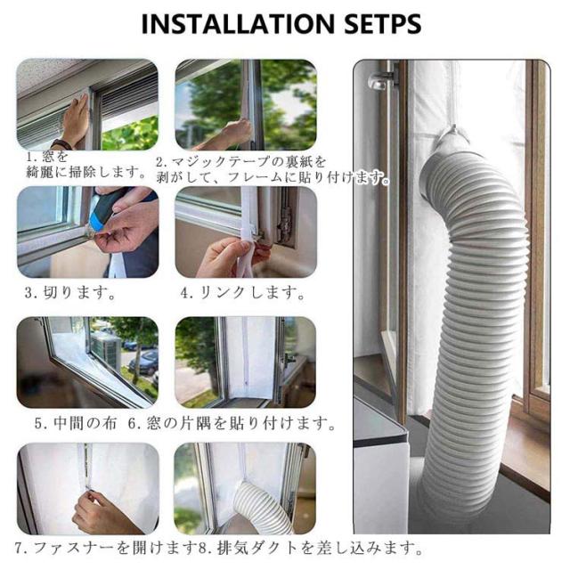 | ファスナー付き 移動エアコン用の密封布。 室内の空気を涼しく保つ。 熱風の侵入を防ぐ! 1.窓を綺麗に掃除します。 2.マジックテープの裏紙を剥がして、フレームに貼り付けます。 3.切ります。 4.リンクします。 5.中間の布 6.窓の片隅を貼り付けます。 7.ファスナーを開けます 8.排気ダクトを差し込みます。 | |