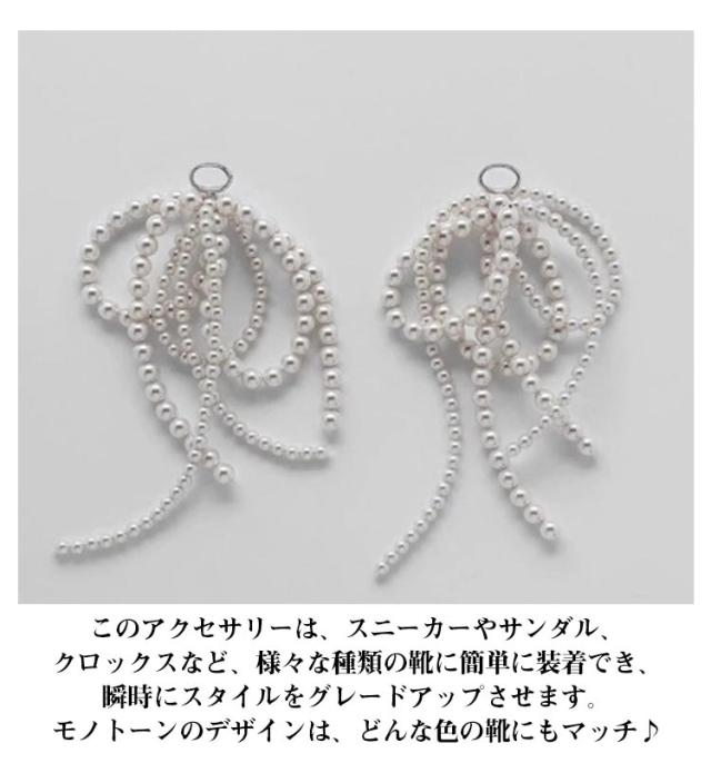 | パール&立体リボン シューピアス このアクセサリーは、スニーカーやサンダル、クロックスなど、様々な種類の靴に簡単に装着でき、瞬時にスタイルをグレードアップさせます。モノトーンのデザインは、どんな色の靴にもマッチ♪ 日常のカジュアルな装いから、特別なイベントまで、幅広いシーンで活躍します。女性らしさを引き立てるデザインで、自分だけのオリジナルシューズを楽しむことができます。 | |