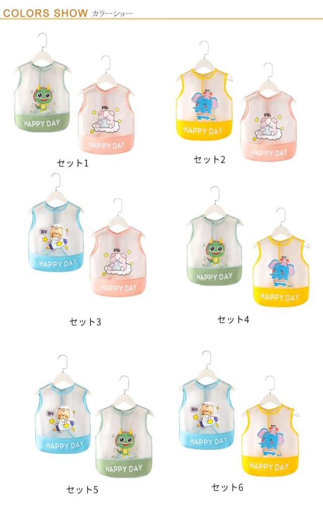 | 2点セット!かわいい柄で使いやすい紐タイプ!夏に使いやすいノースリーブタイプのお食事エプロン 撥水・防水加工で簡単拭取り お手入れ簡単!防水仕様で汚れがつきにくい!洗濯機で丸洗いできるのでお手入れも簡単です 軽量!コンパクト!持ち運びに便利 おしゃれな男の子、女の子にピッタリ。カラフルなデザイン | |