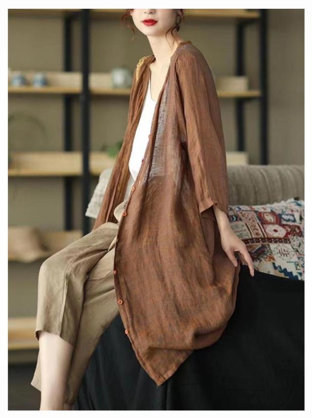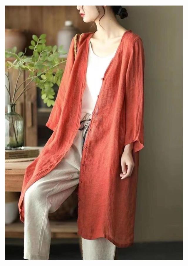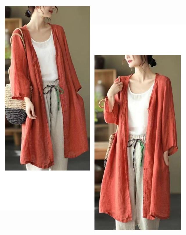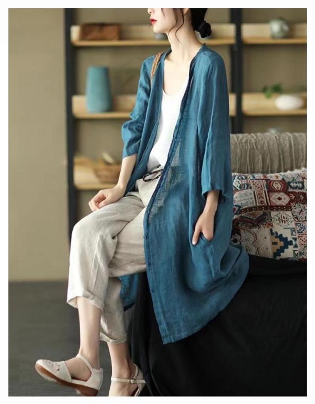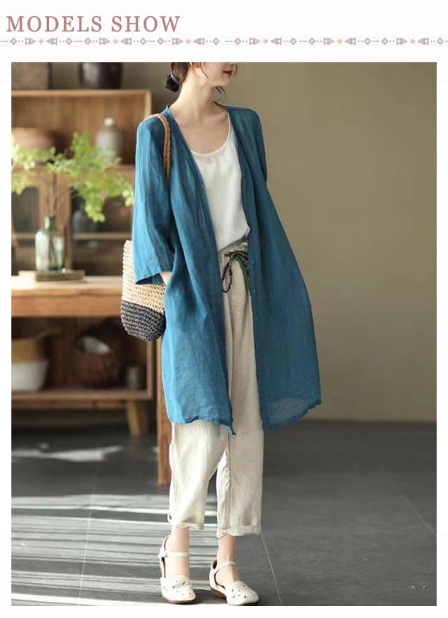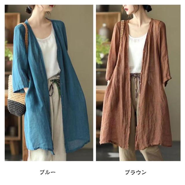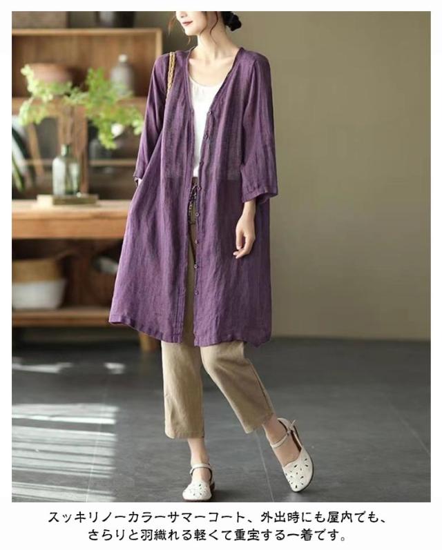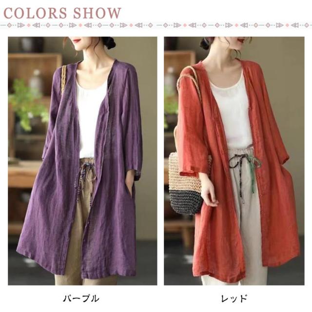 | 軽やかで着心地のよいロング丈カーディガン。 通気性抜群で涼しいリネン羽織り、春夏外出時の紫外線対策やオフィスでの冷房対策としてバッチリ。 スッキリノーカラーサマーコート、外出時にも屋内でも、さらりと羽織れる軽くて重宝する一着です。 素敵な色合いがコーデにアクセントにプラスするだけでスタイルアップ。 | |