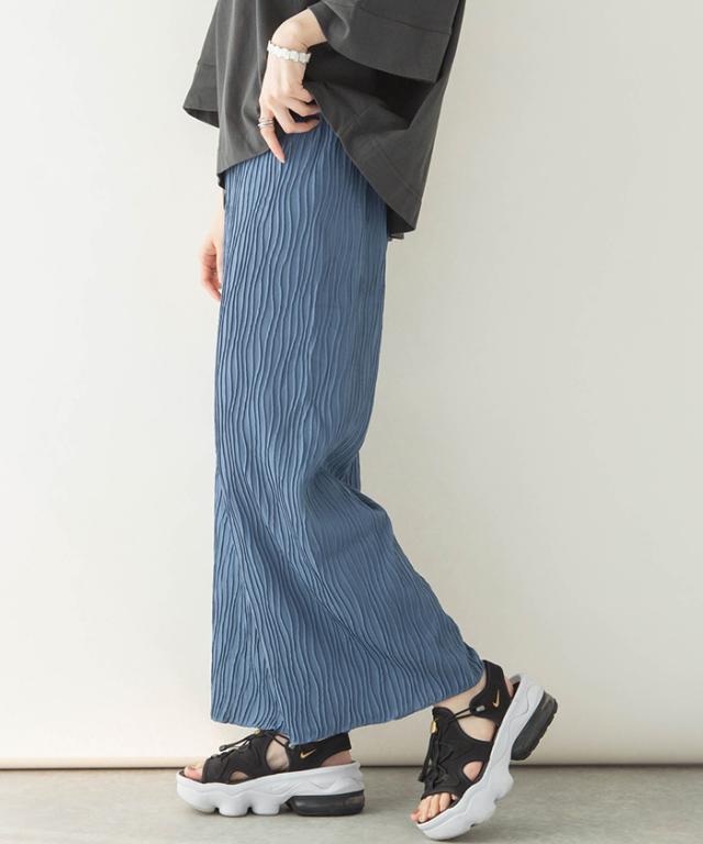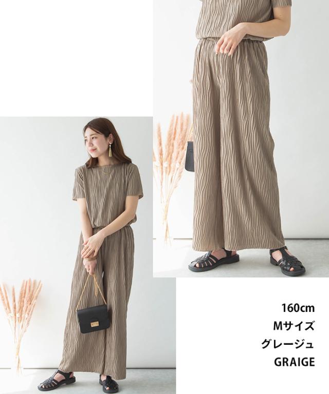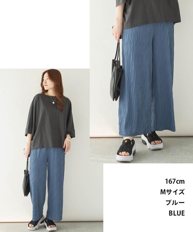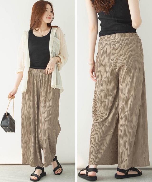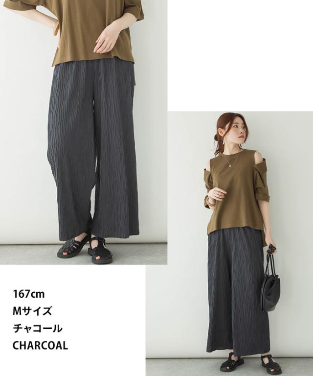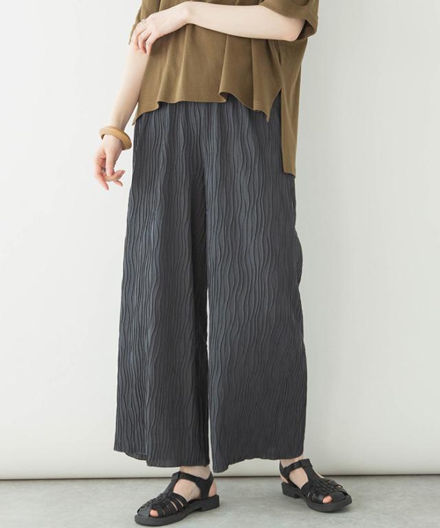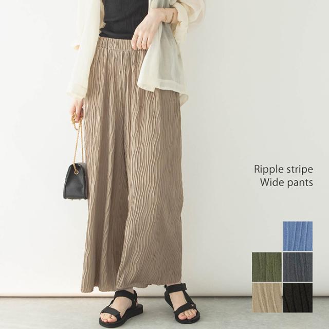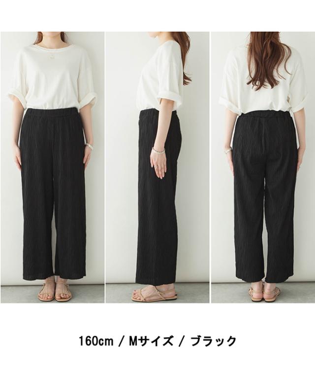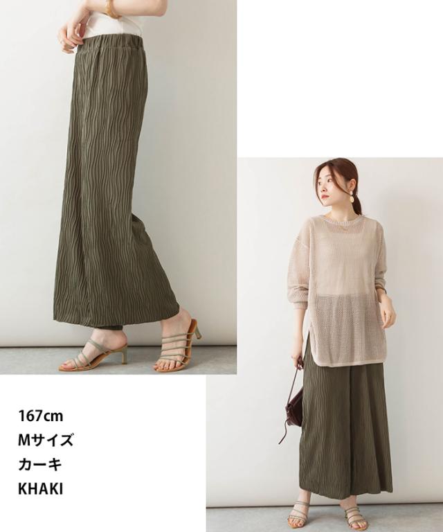 快適さとスタイルを兼ね備えたワイドパンツです。独特のリップルストライプデザインが、個性的ながらも洗練された印象を演出します。カジュアルなルックスからちょっとした外出着まで、幅広いシーンで活躍する一着です。ワイド幅で脚のラインを拾わないでトレンドのシルエットに仕上げてくれる優秀ボトム。これからの季節にぴったりな丈感で、リネントップスやシフォン素材のブラウスなど相性抜群!カジュアルに着こなすなら、ビッグシルエットのTシャツやロンT、パーカーやスウェットトレーナーと合わせても◎足元は、パンプスやローファー、スニーカー合わせでカジュアルスタイルも簡単にきまり、コーデの幅も広がります♪綺麗目なスタイリングから、カジュアルなスタイリングまでトップスによって表情を変えてくれる活躍間違い無しのボトムスです。軽やかで通気性に優れた素材を採用しており、長時間の着用でも快適性が保たれます。