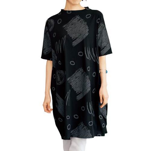 幾何学柄プリントチュニック ブラック チュニック コクーン モックネック 半袖 五分袖 ブラック レディース 婦人服 ミセス シニア 女性 黒 グレー オシャレ アート シンプル シニアファッション 40代 50代 60代 70代 80代 母の日 お母さん 春夏