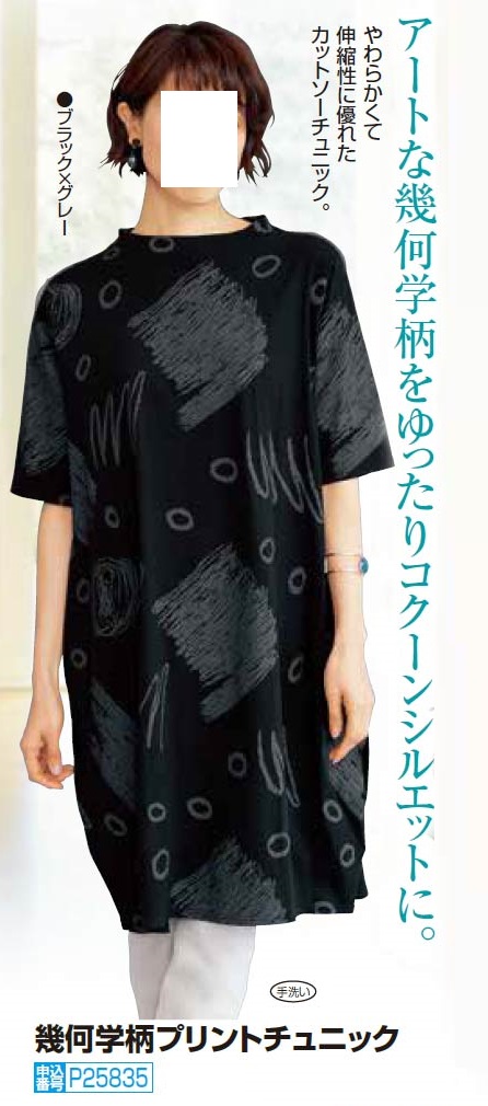 幾何学柄プリントチュニック ブラック チュニック コクーン モックネック 半袖 五分袖 ブラック レディース 婦人服 ミセス シニア 女性 黒 グレー オシャレ アート シンプル シニアファッション 40代 50代 60代 70代 80代 母の日 お母さん 春夏 nss p25835