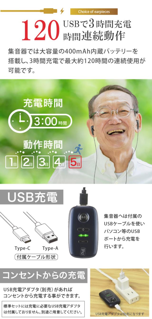 集音器 USB充電 ポケット型 福耳 雷神 -らいじん- 軽量 デジタル 120時間動作