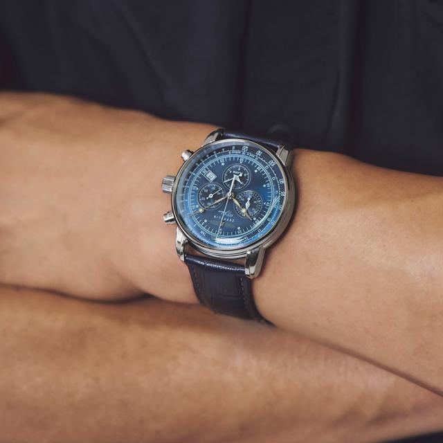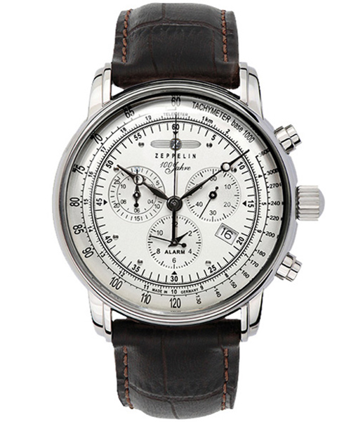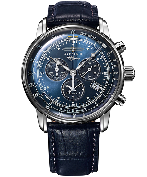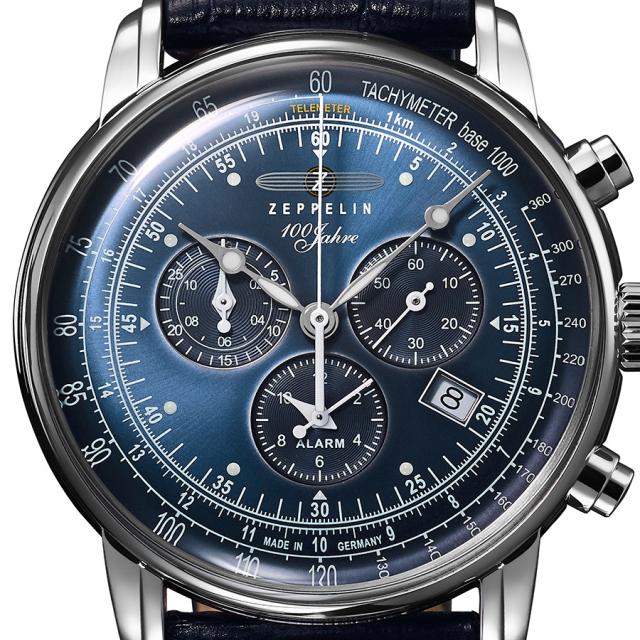 ドイツの歴史的飛行船ZEPPELINの100周年を記念したベストセラー「100周年記念シリーズ」は飛行船の機体をデザインソースに、丸みを帯びたケース、ボンベダイヤルやドーム型のガラスが特徴です。 ダイヤルにはドイツ語で「100周年」を意味する「100Jahre」がデザインされています。 100周年記念シリーズ クロノグラフアラームは、12時間クロノグラフ、12時間アラーム、速度を測るタキメーター、距離を測るテレメーターを搭載。充実の機能を搭載したベストセラーモデルです。