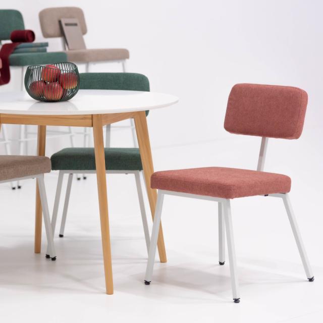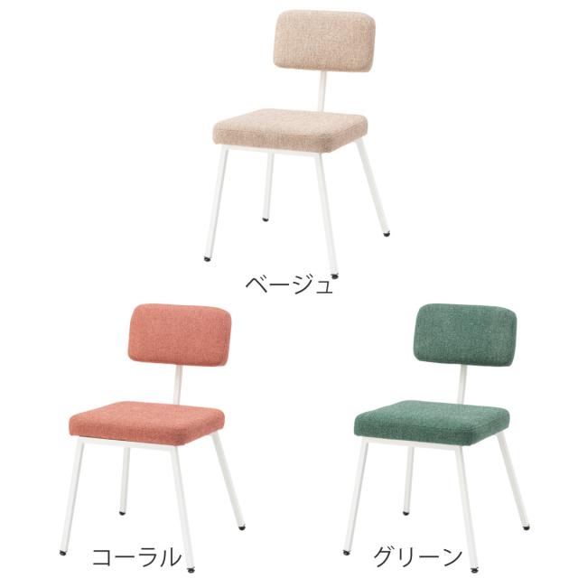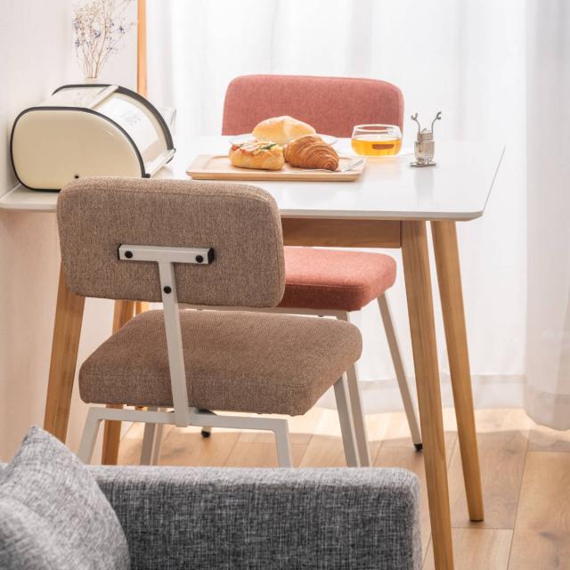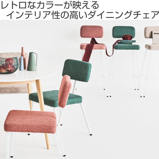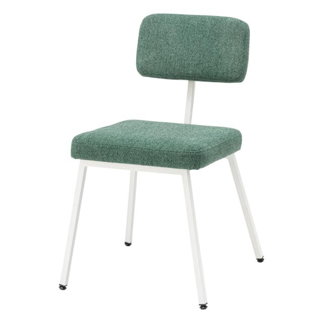 ホワイトカラーのスチールと優しい印象のファブリック生地を採用しました。異なる2つの素材が合わさることで、レトロ調でデザイン性の高いダイニングチェアに仕上げました。