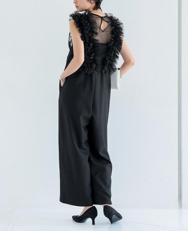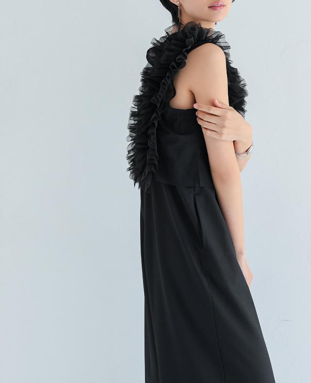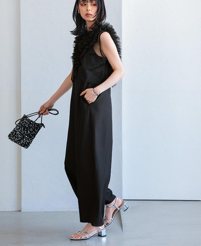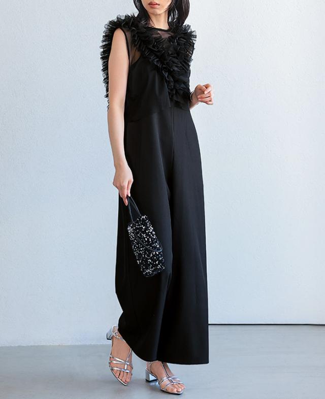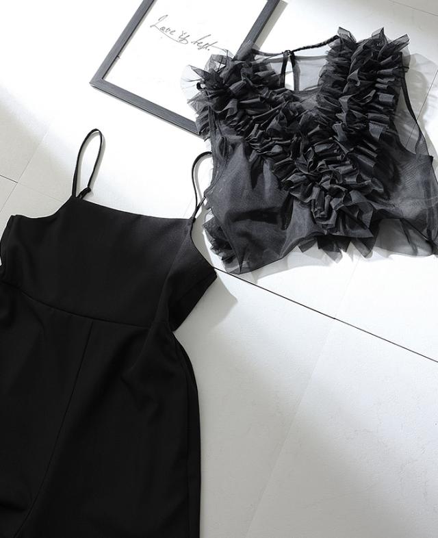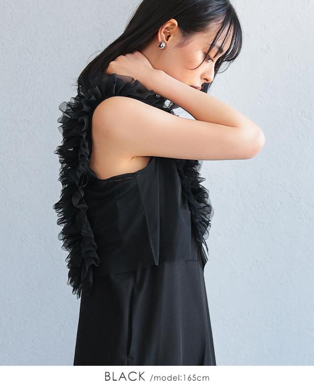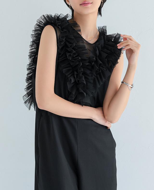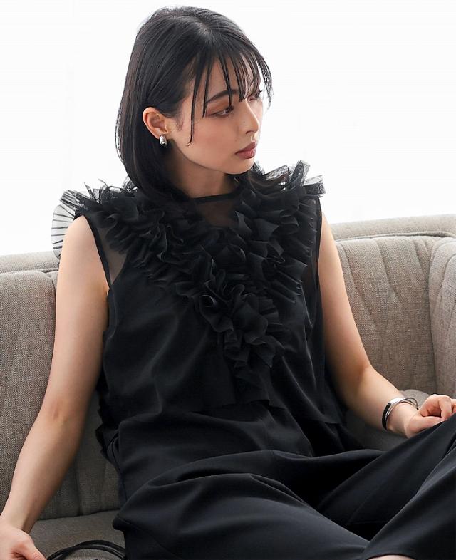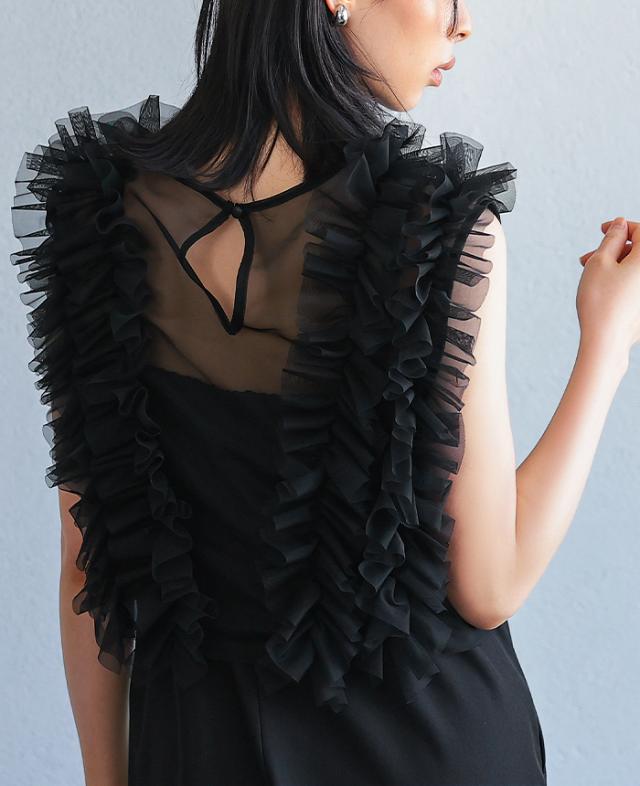 くしゅっとさせたフリルを贅沢にあしらったシアーのベストと、