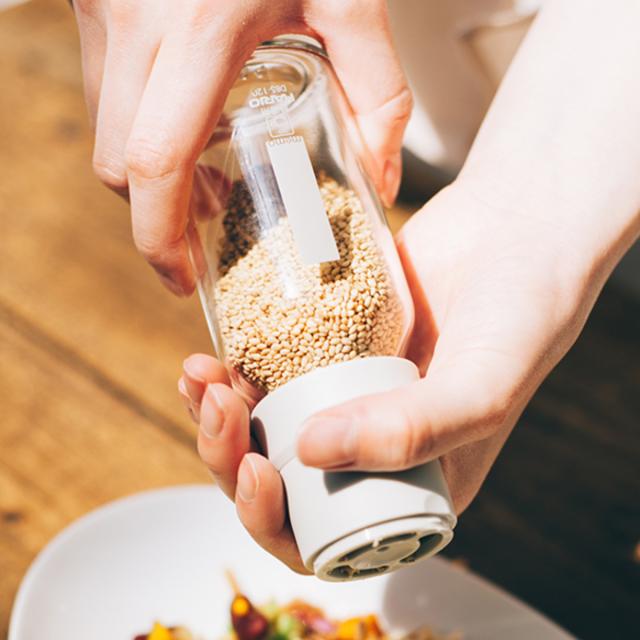 挽きたての香り高いゴマを味わえるゴマ専用ミルです。握りやすく、挽く際にも力が入りやすい、ちょうどいいサイズ感です。透明のボトルで、残量が一目で確認できるので、詰め替えのタイミングが分かりやすく便利です。