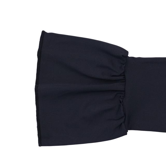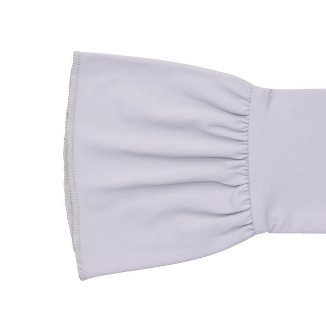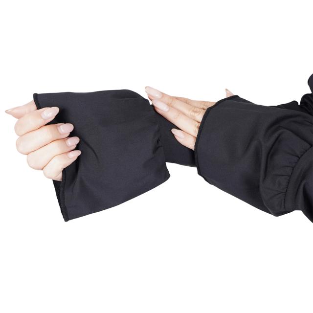 大きめフリルが手元をしっかりカバーするフリルアームカバー。UVカット率99.9になっています。接触冷感素材なので、ひんやり気持ち良くなっていて、暑い夏を少しでも快適に過ごすことができます。手の甲までしっかり日よけでき、手を握ると指先が隠れるサイズ感になっています。