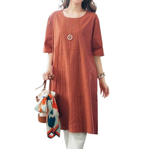 ピンタックデザインワンピース レンガ色 綿麻 ワンピース ひざ丈 丸首 5分袖 クルーネック テラコッタ レディース 婦人服 ミセス シニア 女性 オレンジ ブラウン 五分袖 シンプル シニアファッション 40代 50代 60代 70代 80代 母の日 お母さん 春夏
