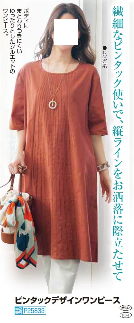 ワンピース ピンタックデザインワンピース レンガ色 綿麻 ワンピース ひざ丈 丸首 5分袖 クルーネック テラコッタ レディース 婦人服 ミセス シニア 女性 オレンジ ブラウン 五分袖 シンプル シニアファッション 40代 50代 60代 70代 80代 母の日 お母さん 春夏 nss p25833