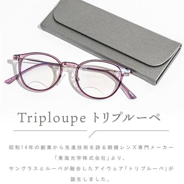【3つの魅力で若々しさを叶える】ファッショングラス×サングラス×ルーペの3つを叶えるアイウェア「トリプルーペ」が新登場。【サングラスとルーペを融合】レンズの下部に目立ちにくい約1.62倍のルーペを採用。視線を下に向けるだけで手元がクリアに。【仕草まで若々しく魅せるヒミツ】メガネを外したり、掛け替える動作が不要になり、クリアな視界と若々しい仕草を同時に叶える♪【有害光線をトリプルブロック】洗練されたデザインで、紫外線・青色光線・近赤外線など様々な光から目を守る新しいスタイル。【驚異の紫外線99.99%超カット】免疫力低下・白内障・シミ・そばかすに影響を与える紫外線を約99.99%効果的にブロック!【近赤外線:約50%カット】真皮の深層部まで届き、目元のシワやたるみなど老化の原因となる近赤外線もしっかりカット。【ブルーライト(青色光)にも効果的】パソコンやスマホの液晶画面が発する青色光をブロックし、網膜の色素「ルテイン」を保護。【長時間でも快適な掛け心地】掛けていてもほとんど重さを感じさせない約14.5gの超軽量ボディで、ふんわり快適な掛け心地。【掛けるだけで、華やかな印象に】軽やかな細身のフレームと、レンズの縦幅を深くしたシルエットで小顔に見せて華やかな印象に。【柔らかく優しいフィット感】鼻跡が付きにくいしなやかなクリングスと顔の輪郭に添うフレーム構造で、驚くほどのフィット感。【専用メガネケース&クロス付き】サングラスを掛けている時はコンパクトに折りたためる専用メガネケース&メガネクロスが付属。【シンプルなフロントデザイン】上品な曲線ラインが知的な印象を醸しだす「ウェリントン」シェイプで、「デキる大人」を演出。【手元の色味はクリアに】レンズの上部から徐々に色味が薄くなるグラデーションカラーで、ルーぺ部分は透明感をキープ。【女子開(ジョシカイ)開発商品】女性だからこそこだわる「美しくありたい」を目指し、魅力ある商品をカタチに・・・。女性のための商品開発チーム「ジョシカイ」が企画開発。