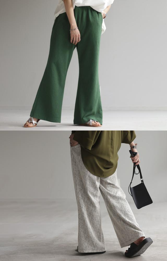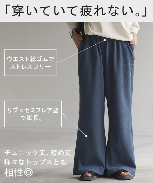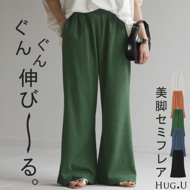 パンツ 超伸び カラーパンツ レディース リブパンツ 一部4月下旬入荷 セミフレア フレア ワイドパンツ ロング ワイド 大きいサイズ ボトム 体型カバー ボトムス フレアパンツ ずぼん ズボン ハイウエスト ゴム プリーツ ストレッチ 緑 黒 春 夏 きれいめ HUG.U 秋新作