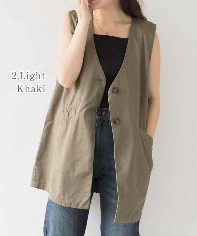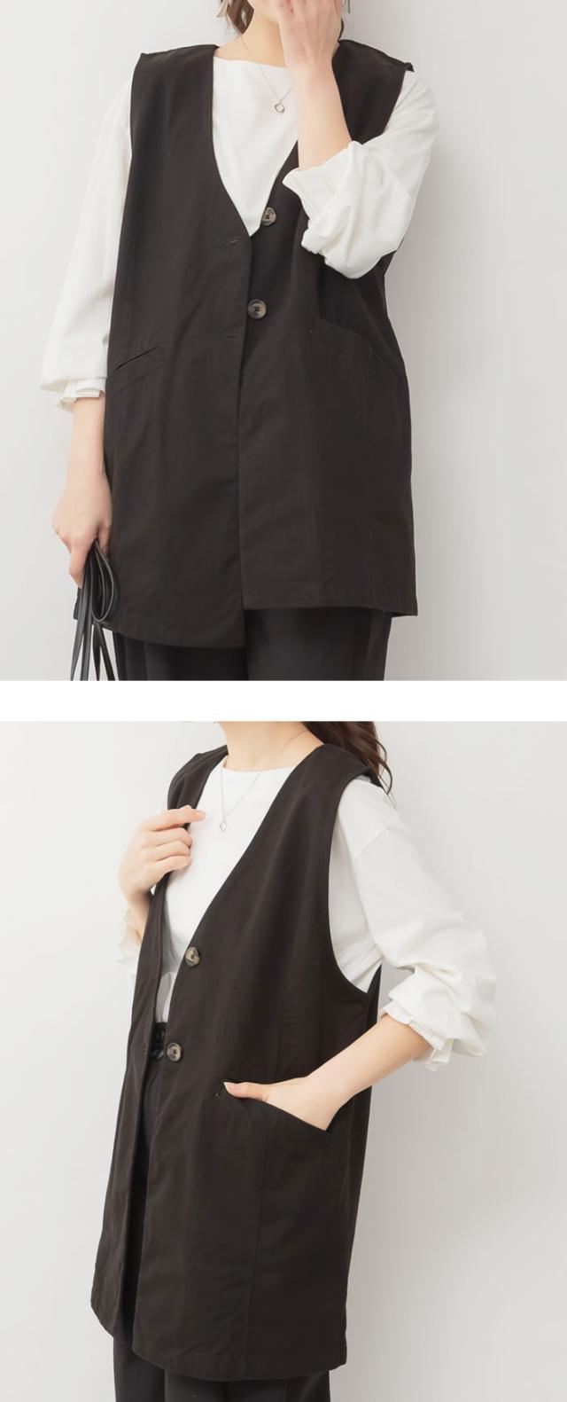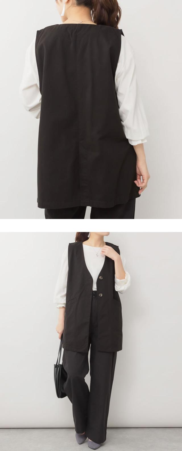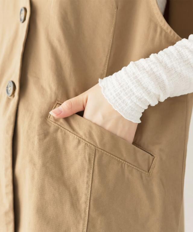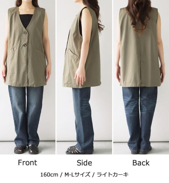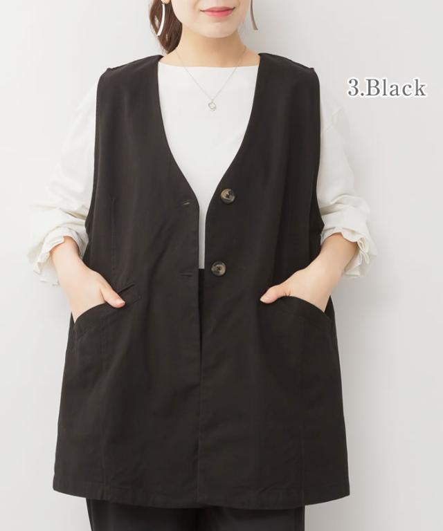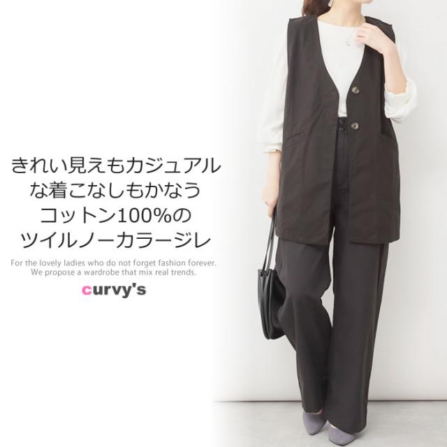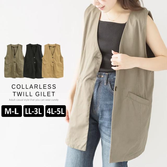 ジレ ベスト レディース ゆうメール便送料無料 ノーカラー コットン ポケット ロング丈 レイヤード カジュアル 5営業日以内入荷 大きいサイズ レディース M L LL 3L 4LLARU ラルー ツイルノーカラージレ