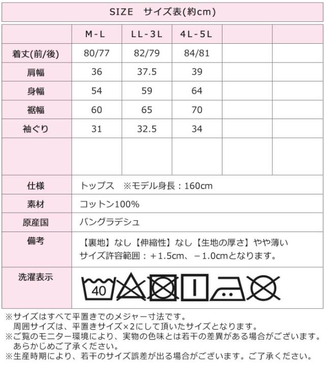 ■サイズ:[M-Lサイズ]着丈(前/後)80/77cm・肩幅36cm・身幅54cm・裾幅60cm・袖ぐり31cm [LL-3Lサイズ]着丈(前/後)82/79cm・肩幅37.5cm・身幅59cm・裾幅65cm・袖ぐり32.5cm [4L-5Lサイズ]着丈(前/後)84/81cm・肩幅39cm・身幅64cm・裾幅70cm・袖ぐり34cm