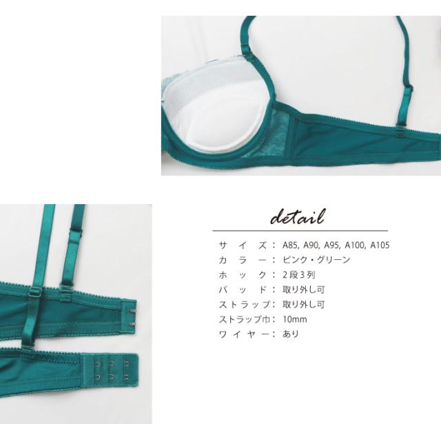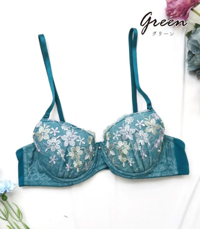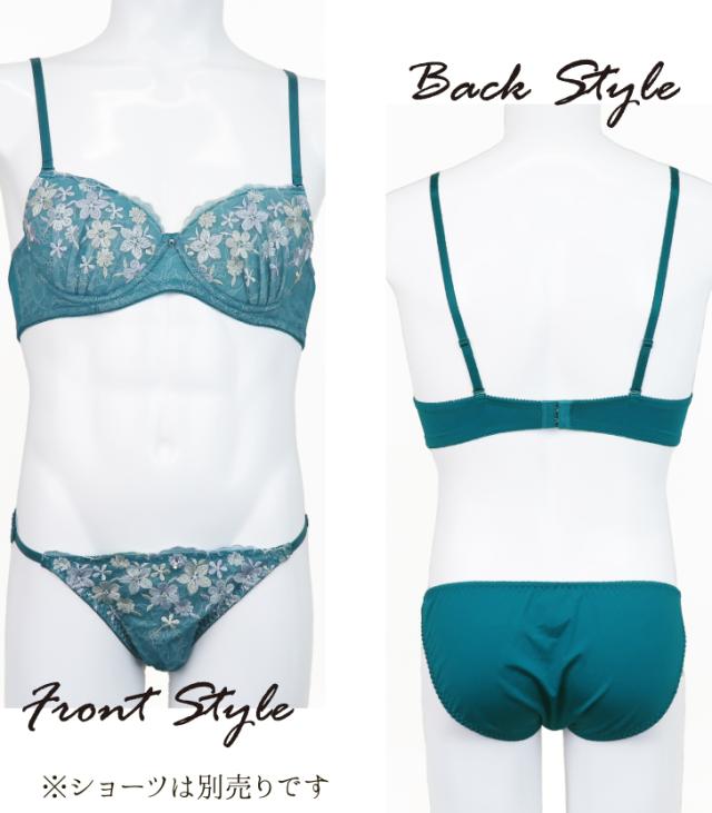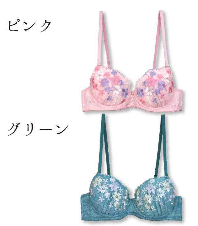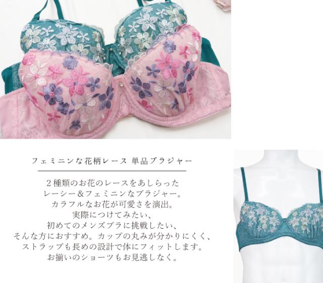 2種類のお花のレースをあしらったレーシー&フェミニンなブラジャー。カラフルなお花がかわいらしさを演出。実際につけてみたい、初めてのブラに挑戦したい、そんな方におすすめ。カップの丸みがわかりにくく、ストラップも長めの設計で体にフィットします。おそろいのショーツもお見逃しなく。